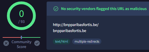 Eens je de domeinnaam gevonden hebt kan je proberen inschatten of deze veilig is. Je kan hierbij als hulpmiddel de website van Virustotal gebruiken, en daar de domeinnaam ingeven. Wordt de domeinnaam door minstens 1 dienst als onveilig gemarkeerd, dan is de website vermoedelijk onveilig! Geven we het domein uit het voorbeeld van hierboven in, dan blijkt dat ‘in principe’ veilig te zijn. Dat zie je duidelijk aan de groene markering, en het groene vinkje bij de controle.